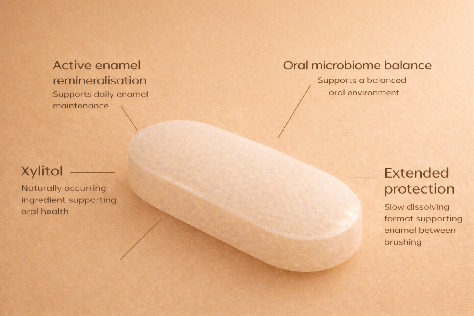 A slow-dissolving oral systemSupporting remineralisationAnd maintaining balance in the oral environment